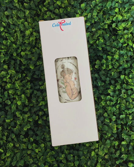 This design captures the tender power of motherhood with a graceful illustration of a mom holding her baby, surrounded by gentle florals, soft hearts, and leaves that symbolize growth and deep connection.